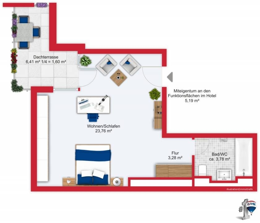 Das Appartment Nr. 407 ist mit einer Fläche von 32,42 m² + 5,19 m² Miteigentum an den Funktionsflächen im Hotelkomplex bewertet.Anhand der eingestellten Objektfotos können Sie sich einen ersten Eindruck über die moderne Ausstattung verschaffen.