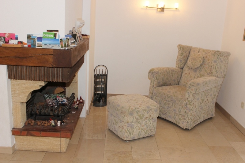 Der offene Kamin sorgt auch an kühleren Tagen für Gemütlichkeit und Atmosphäre. Garderobe und Gäste-WC sind im Eingangsbereich zu finden.