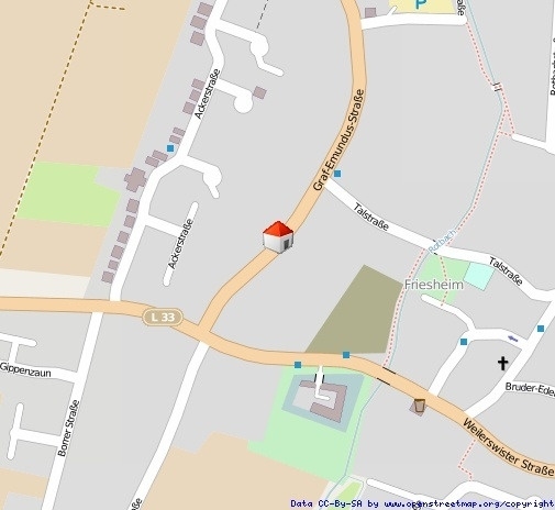 Die Vierkanthofanlage liegt im alten Dorfzentrum von Erftstadt-Friesheim und ist umgeben von Bauerhöfen und Gartenland.Erftstadt-Friesheim hat ca. 3.000 Einwohner. Arzt, Zahnarzt, Apotheke, 2 Banken, 2 Bäckereien, Kindergarten befindet sich im Ort, die Grundschule ist ca. 3 KM entfernt.