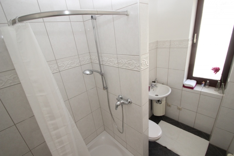 Bad mit Tageslicht: Dusche, Waschbecken, WC, Handtuch-Heizkörper