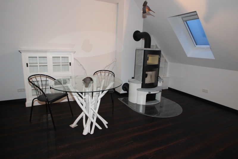 Das große Wohn-/Esszimmer mit Kaminofen und der anschließende Balkon in Süd-Ost-Lage vermitteln ein Gefühl von Leben in entspannter Atmosphäre.