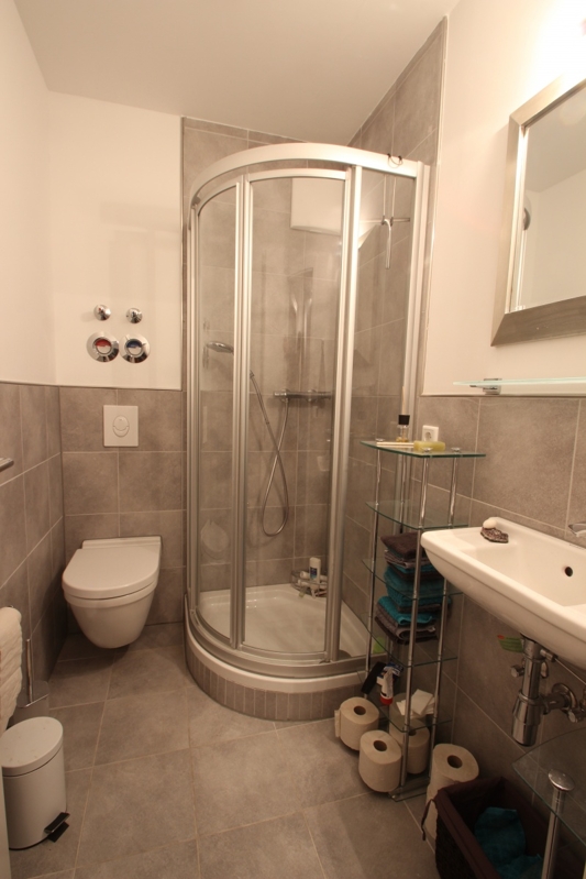- Feinsteinzeugfliesen - grau im Bad - hellgrau im Gästebad