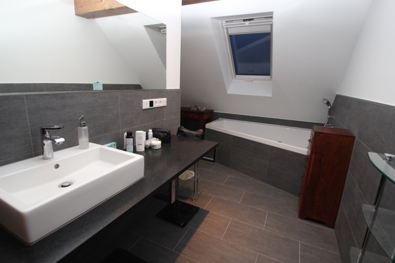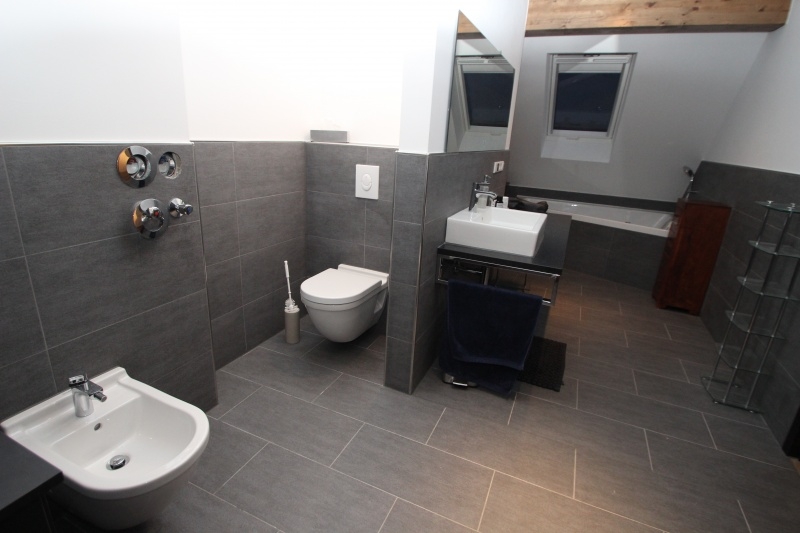Traumhaft ist auch das moderne Bad auf der zweiten Ebene mit allem was das Herz begehrt; ob Eckwanne für Zwei mit Whirlpool-Funktion, ebenerdiger beleuchteter Dusche, Hänge-WC & BD oder der stylische Waschtisch mit großem Spiegel.