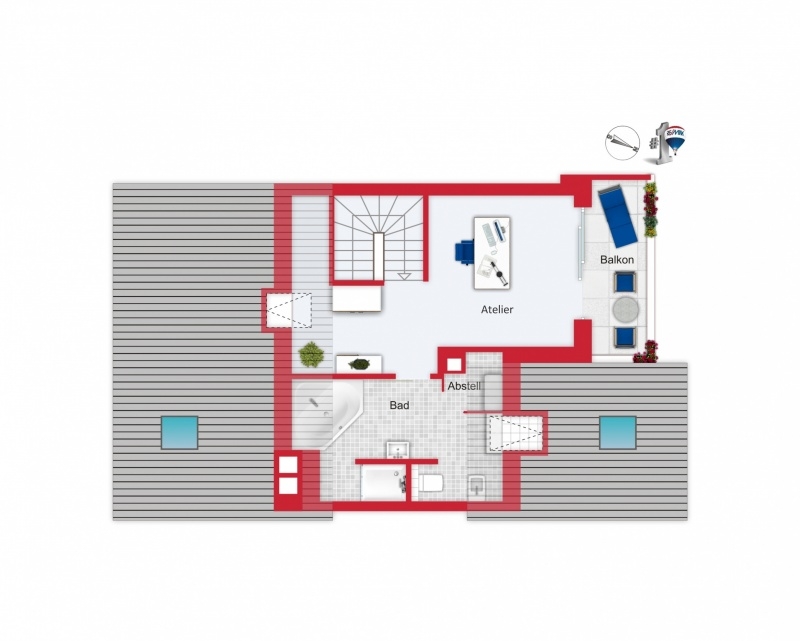 Der vom Atelier zugängliche zweite Balkon mit Nord-West-Ausrichtung auf der zweiten Ebene lädt zum Entspannen und Relaxen nach Feierabend und am Wochenende ein. Genießen Sie hier fernab vom alltäglichen Stress im Strandkorb den Blick ins Grüne.