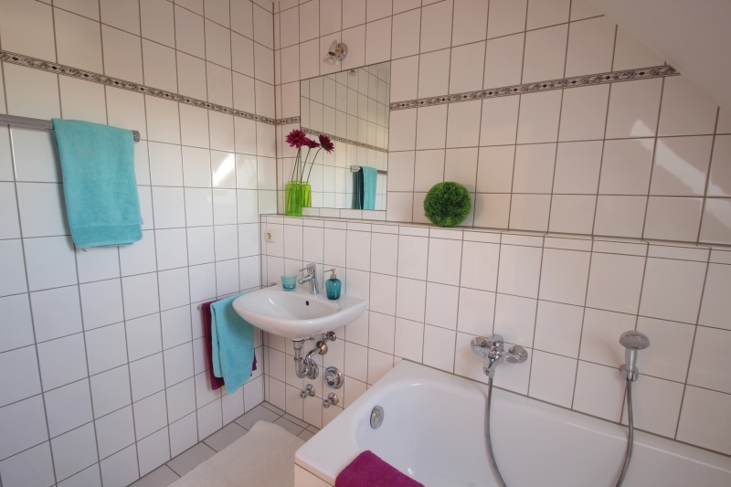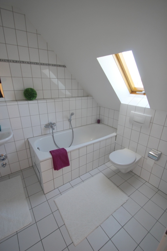Bad: mit Fenster & Wanne, Hänge-WC, Waschbecken - weiß