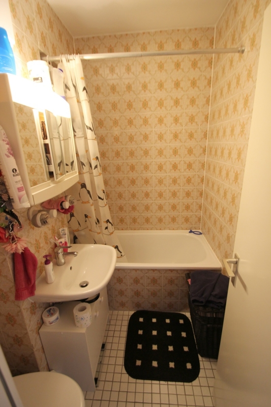 Bad: mit kleiner Wanne, WC, Waschbecken - Fliesen
