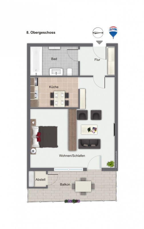 Wohnfläche ca. 30 m², 1 Zimmer, 8. Obergeschoss, Balkon mit West-Ausrichtung