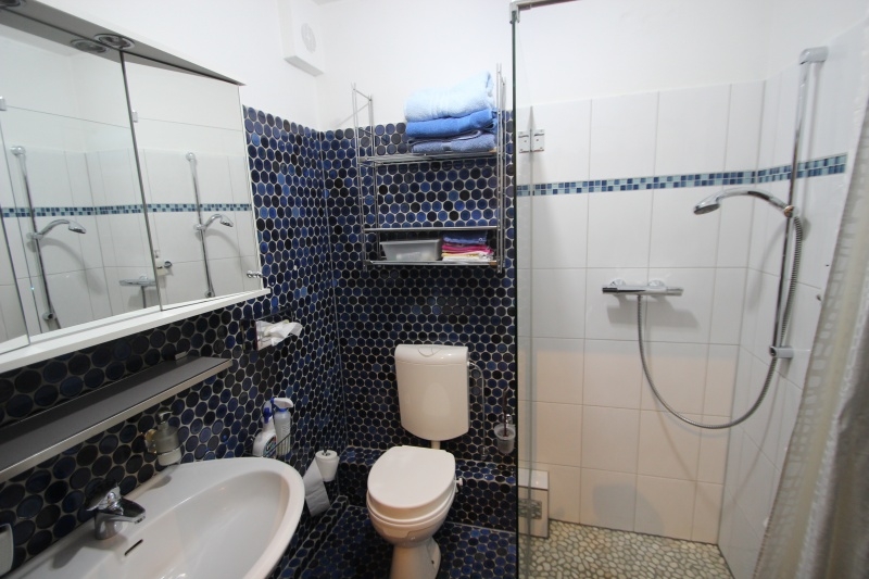 Das Badezimmer wurde modernisiert und verfügt über eine ebenerdige Dusche, ein WC und einem Waschbecken.