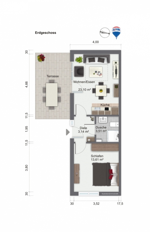 Im Wohn-und Essbereich ist eine Küchenzeile integriert. Bei Bedarf kann auch eine eigene Küchenzeile eingebaut werden. Des Weiteren befindet sich hier der direkte Zugang zur Terrasse.