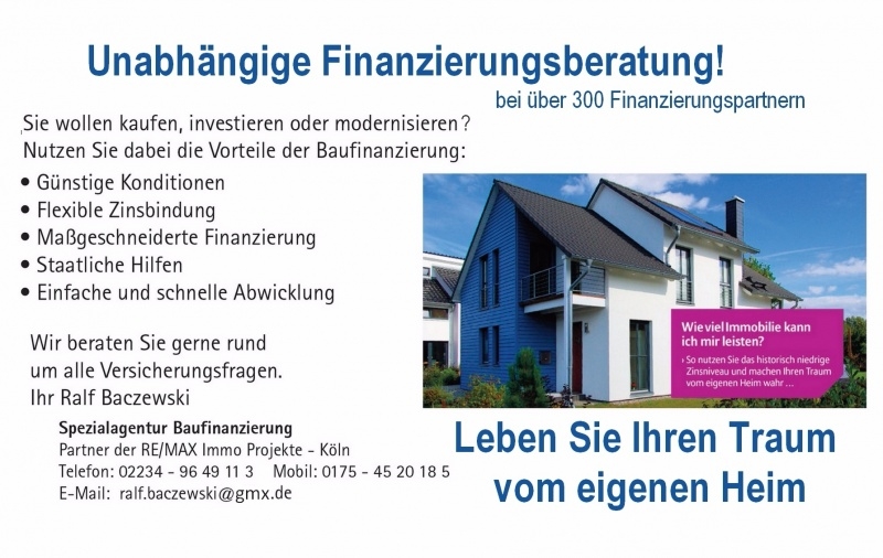 Fragen Sie uns auch nach den zur Zeit interessanten Finanzierungsmöglichkeiten oder nutzen Sie den Zinsrechner auf unserer Internetseite!