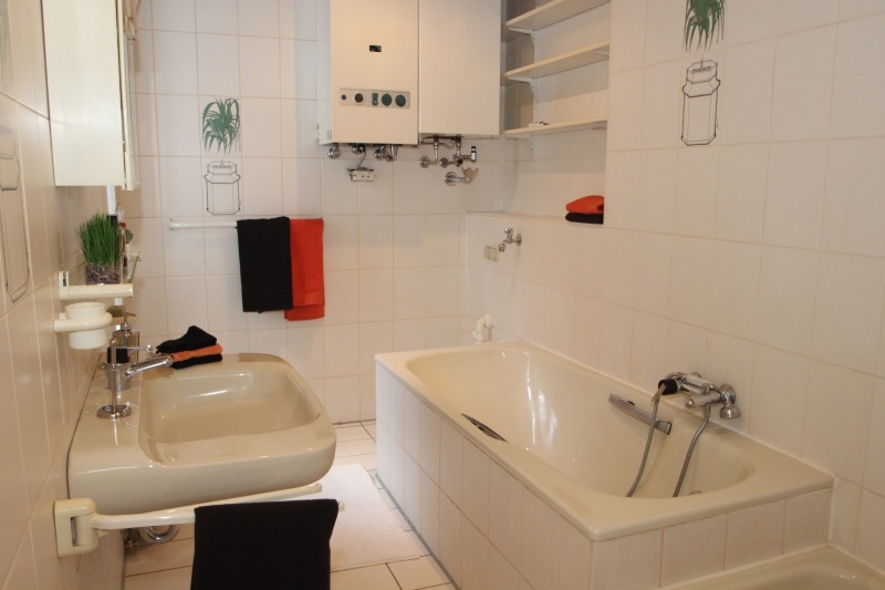 Bad mit Tageslicht: Badewanne, Dusche, Waschbecken, optisch abgetrenntes WC (1983)