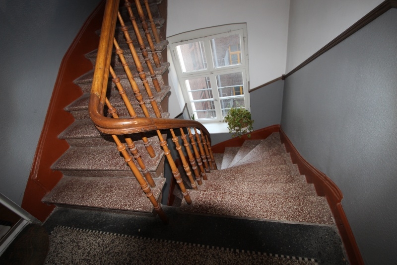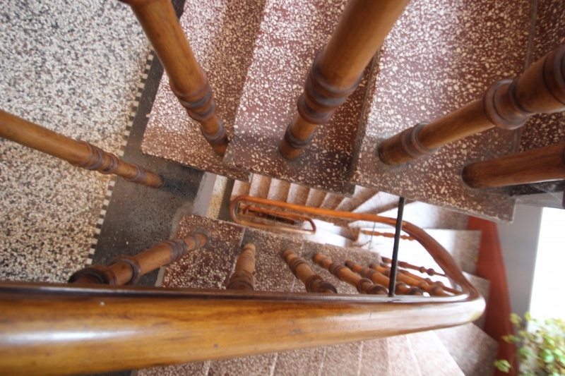 Flur und Treppe aus rot-weiß-schwarzem Terrazzofußboden mit Holzgeländer