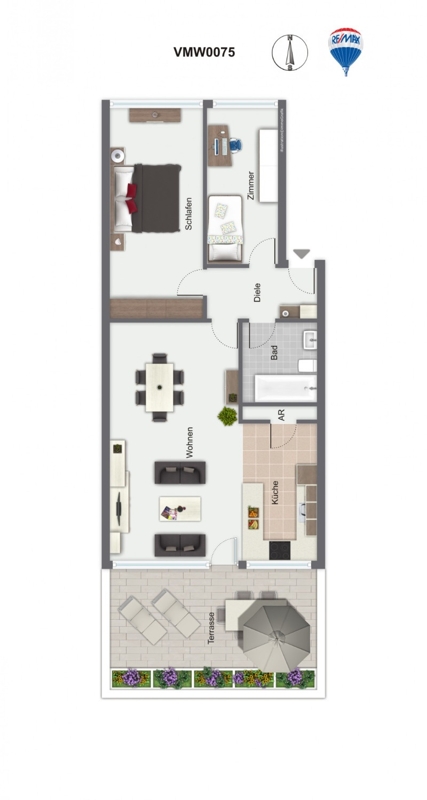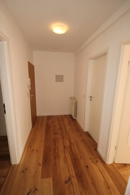 Diele mit Zugang in das helle Kinder- und Elternschlafzimmer, in das Badezimmer sowie in den größzügigen Wohn- und Essbereich mit offener Küche. In dem Wohn- und Essbereich befindet sich der Austritt zum Balkon.