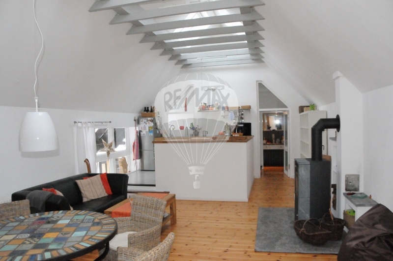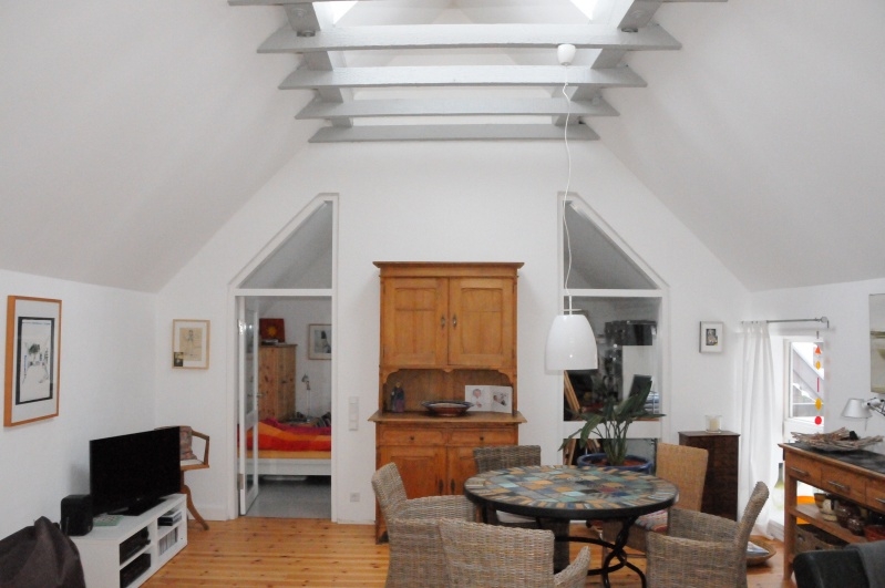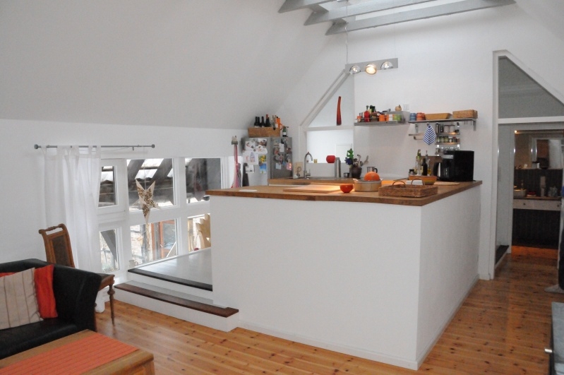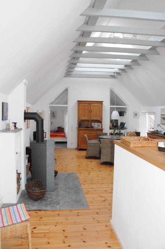 Modernes Wohnen in historischem Ambiente; diese offen gestaltete Wohnung im Obergschoss eines Nebengebäudes in der Vierkanthofanlage strahlt Wohlfühlatmosphäre aus.Der große offene Wohnbereich mit integrierter Küche im Thekenstil, das an den Wohnbereich angrenzende Schlafzimmer und ein schickes Bad bietet Wohnen mit Flair. Der Kaminofen strahlt Gemütlichkeit an kalten Wintertagen. Insbesondere die Deckenhöhe mit freiliegenden Holzbalken - weiss gestrichen- vermittelt Modernietät und Ursprünglichkeit.