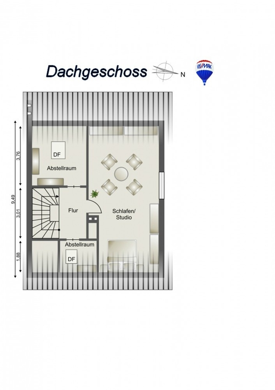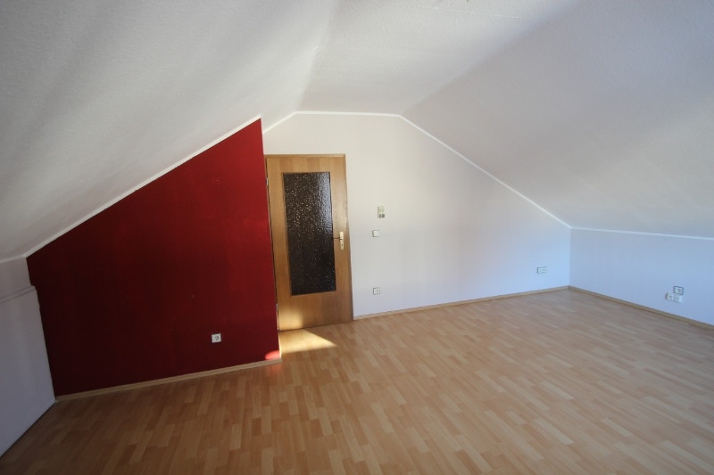 Böden: Fliesen (Bad, Küche), Stabparkett (Wohnzimmer), Teppich (Schlafzimmer), Laminat (Dachgeschoss)