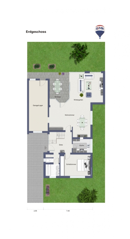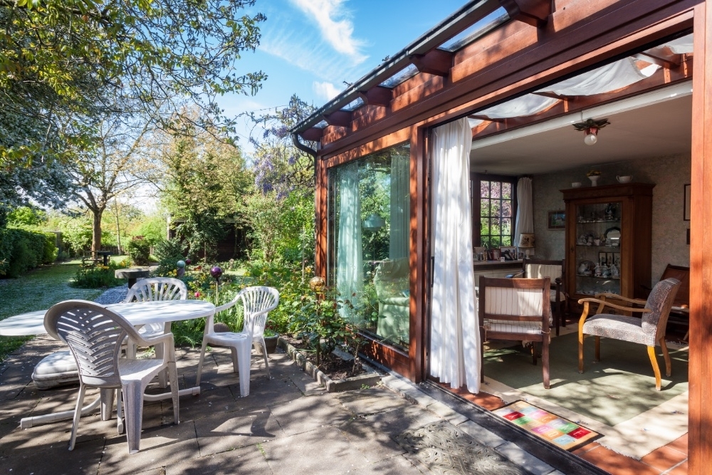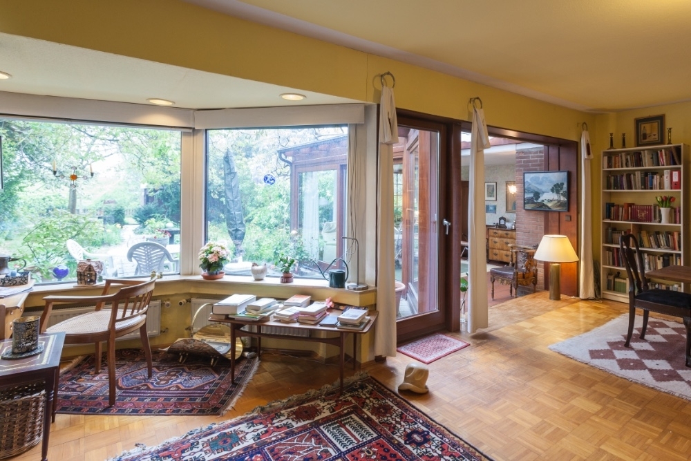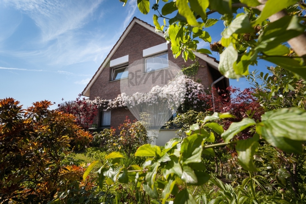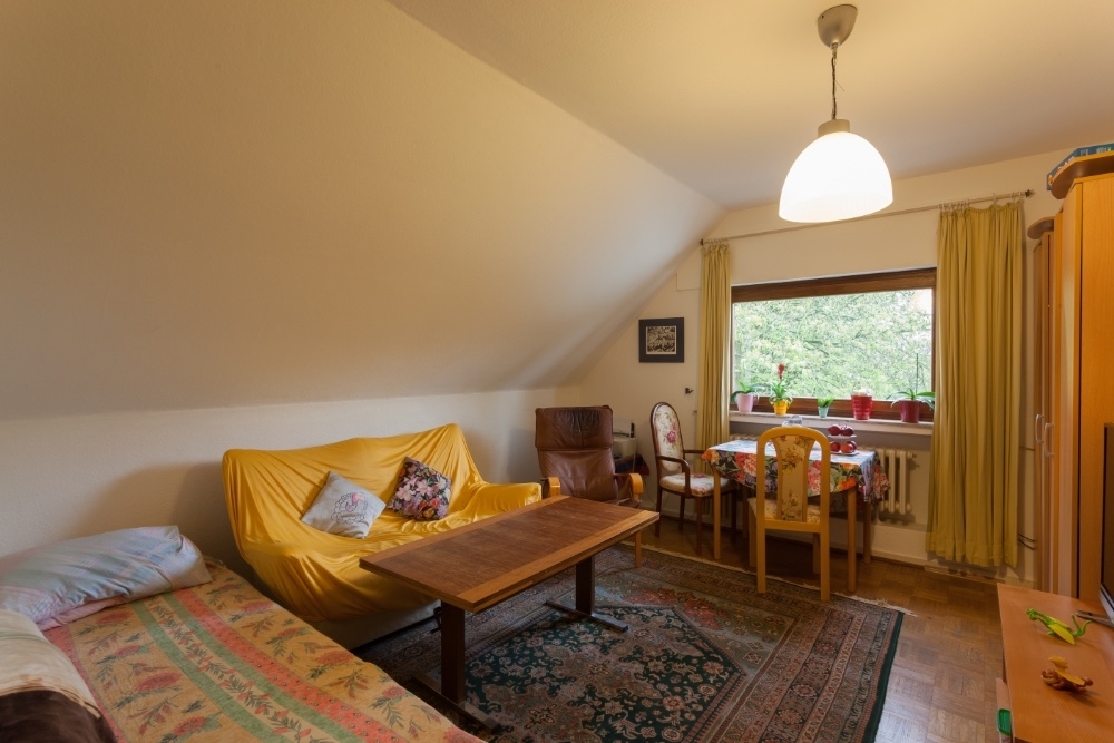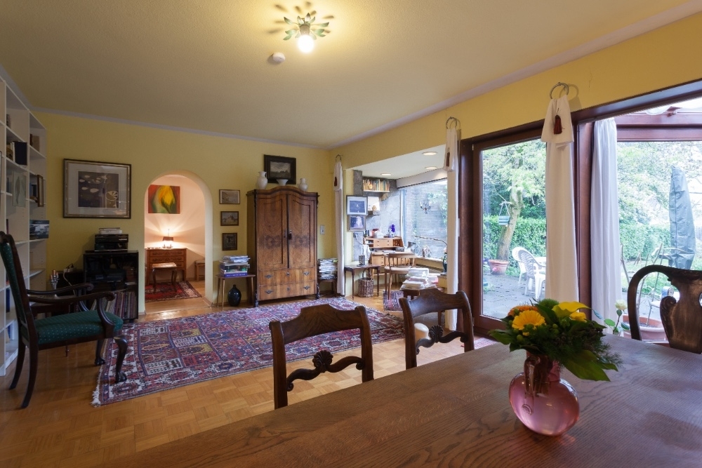 Das großzügige Wohnzimmer mit Wintergarten und anschließender Terrasse sowie der gepflegte, einladende und sonnenverwöhnte Garten bieten Wohnkomfort und Wohlfühlatmosphäre für die ganze Familie. Im Obergeschoss befindet sich eine mit dem Verkauf freiwerdende ca.38 m² große 2-Zimmer-Einliegerwohnung mit Blick in den herrlichen Garten.