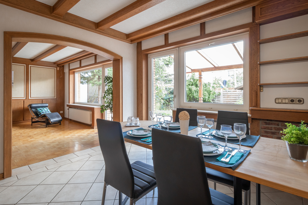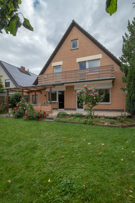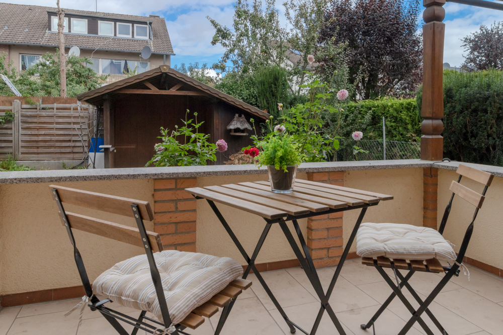 Die große und teilweise überdachte Terrasse mit gepflegtem Garten lädt dazu ein, mit Freunden und Familie Zeit zu verbringen. Dort kann man den Ausblick in den Garten auch bei weniger gutem Wetter genießen.