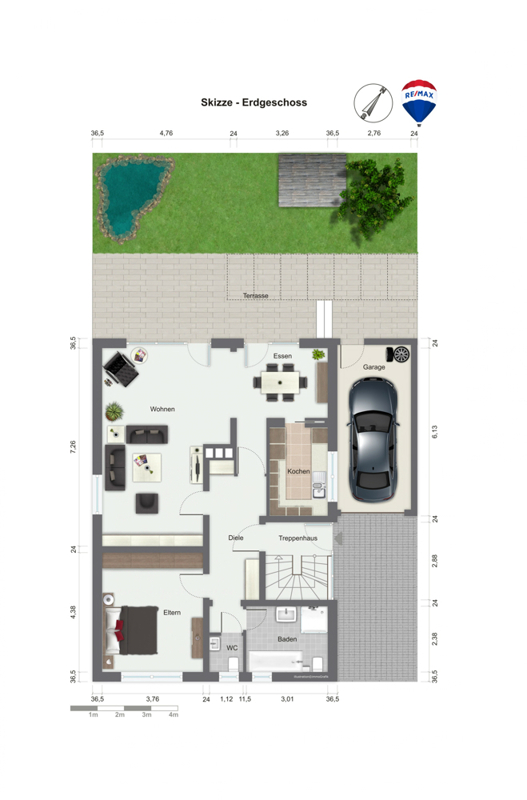 Das Angebot wird abgerundet durch den schön angelegten Vorgarten mit Garage und Stellplätzen.