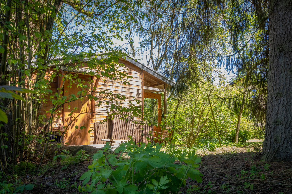 Die hintere Grundstücksgrenze bildet der malerische Bachlauf, gesäumt von altem Baumbestand. In dieser idyllischen Umgebung können Sie die Nachmittagssonne am Gartenhaus genießen.
