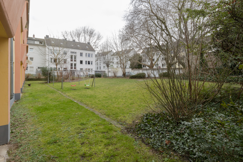 Der großzügige Gemeinschaftsgarten lädt zum Verweilen oder zum Spielen für Kinder ein. Trotz der sehr zentralen Lage in der Kölner Innenstadt kommt die Privatsphäre und der Blick ins Grüne nicht zu kurz.