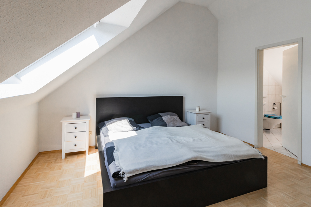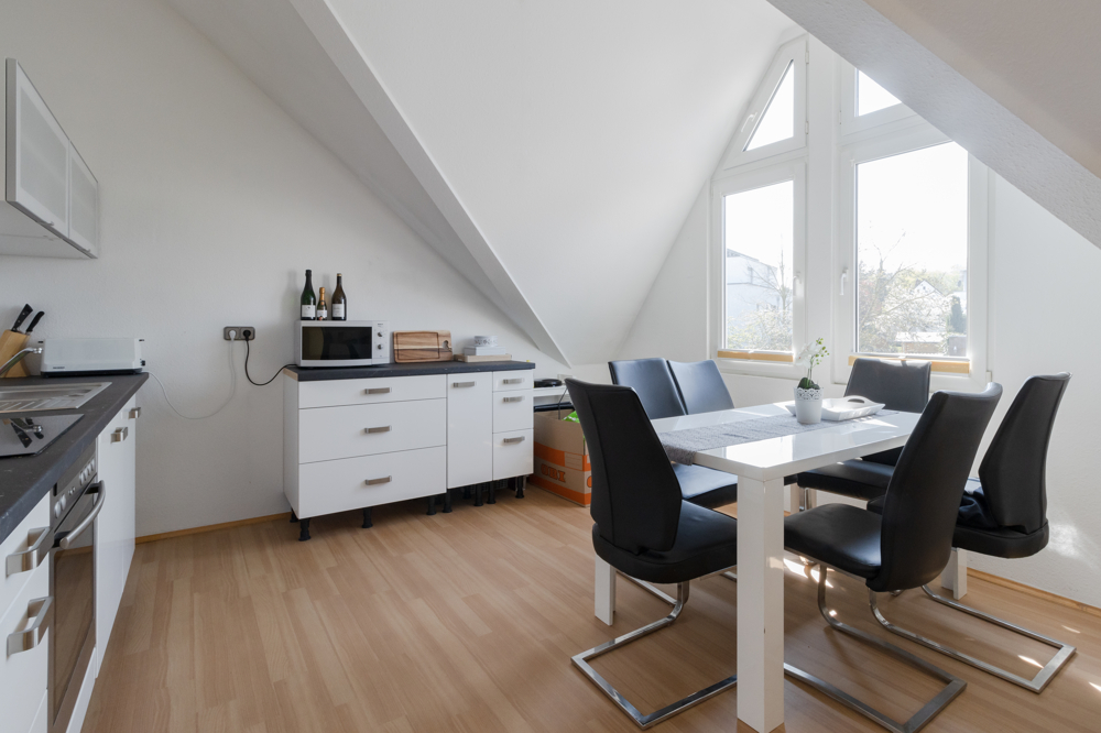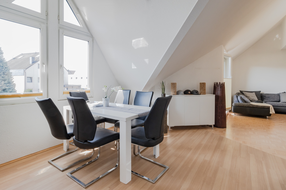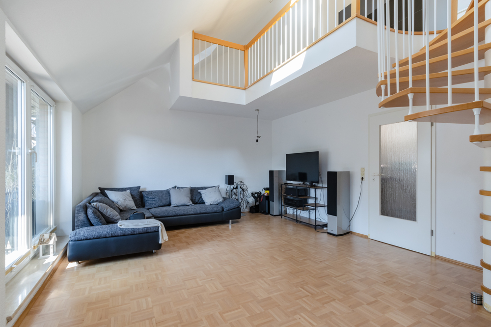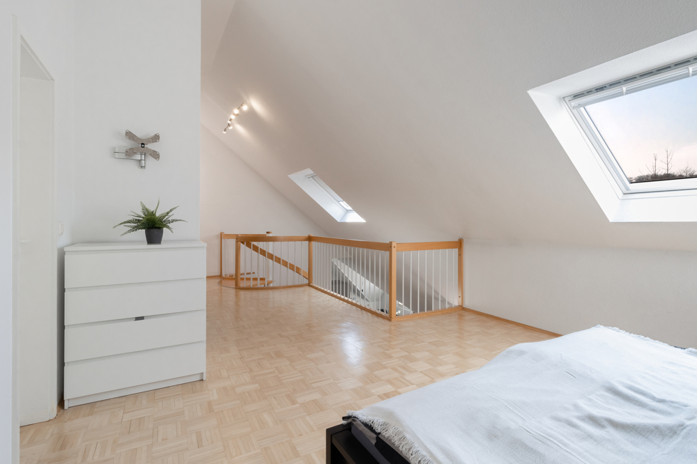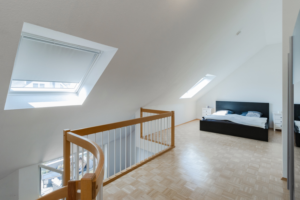 Obwohl sich die Wohnung im Dachgeschoss befindet, hat man hier dank der Galerie mit der hohen Decke ein tolles Raumgefühl und fühlt sich aufgrund der Schrägen nicht beengt.