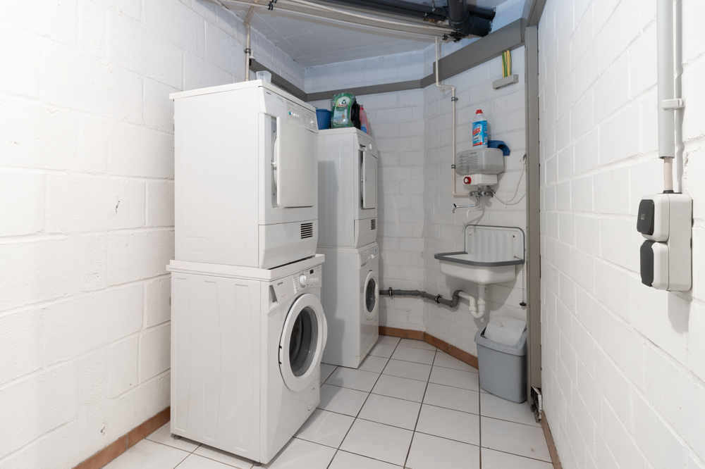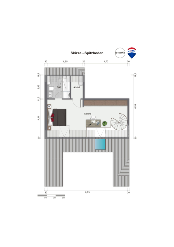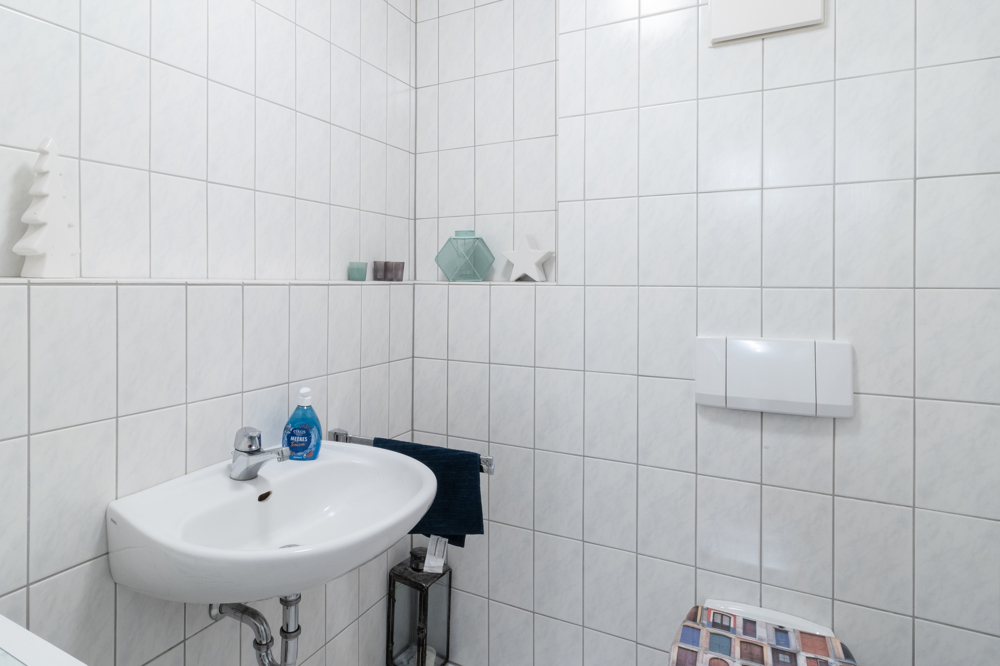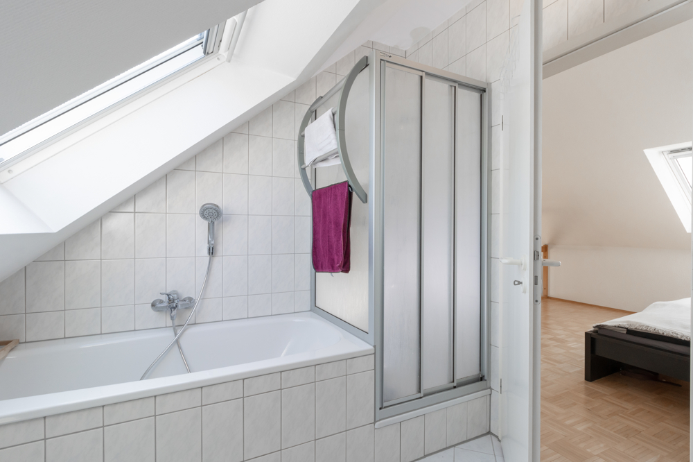 Über die Wendeltreppe erreicht man den Schlafbereich, welcher an ein sehr gepflegtes Badezimmer mit Badewanne sowie Dusche angrenzt. Die neutralen Fliesen erlauben problemlos eigene Kreativität. Ein praktischer Abstellraum gewährt genug Stauraum für etwaige Haushaltsgeräte.