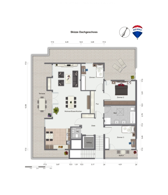 Die Wohnung zeichnet sich durch den großzügigen Wohn- / Essbereich mit offener Küche, sowie zwei direkten Zugängen zum umlaufenden Balkon und zu den sonnigen Terrassen aus.
