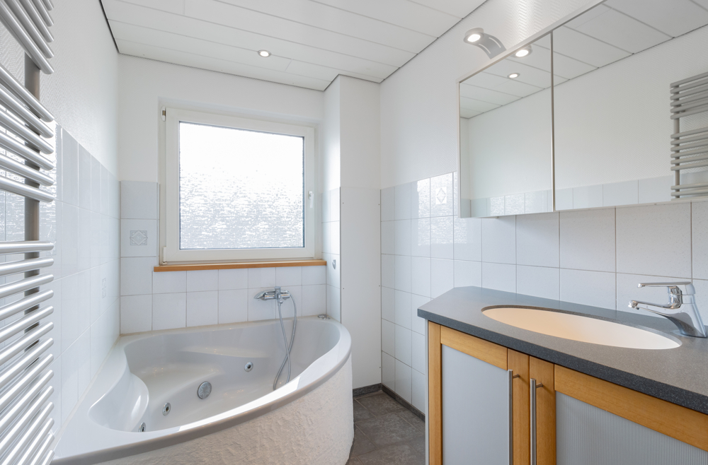 Auch eine Einbauküche und ein großes Badezimmer sind vorhanden und runden das Angebot der schönen Wohnung ab. Das Badezimmer mit direktem Zugang zum Schlafzimmer bietet sowohl eine gemütliche Eckbadewanne, als auch eine getrennte Dusche, die sich mit dem WC auf einer erhöhten Stufe befindet.