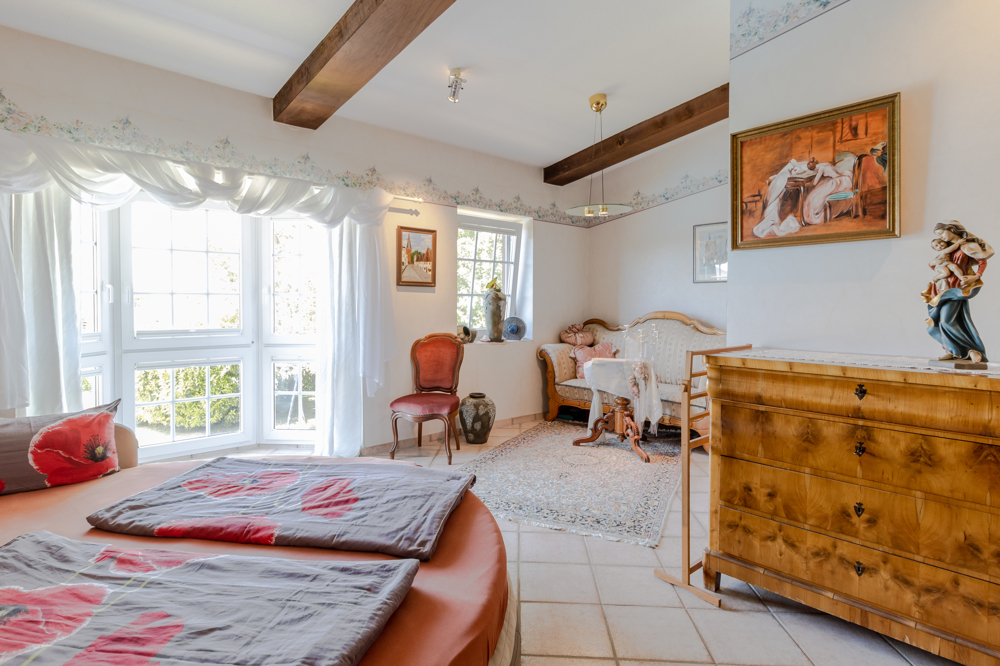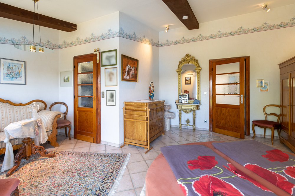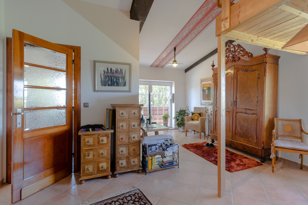 Diesem Wohnraum schließt sich die Küche an von der aus Sie Zugang zu einer großen Terrasse haben. Rechts vom Eingang sind das Elternschlafzimmer mit einem begehbarem Kleiderschrank und das Kinderzimmer mit Zugang zu einer weiteren Terrasse. Unter dieser Terrasse befindet sich der Rosengarten, welcher dieser Wohnung ebenfalls zugeordnet ist. Von hieraus könnte man einen direkten Zugang in den Garten verwirklichen.