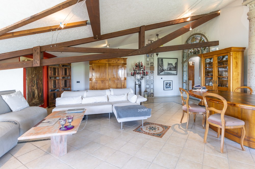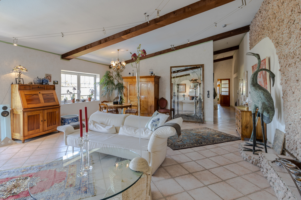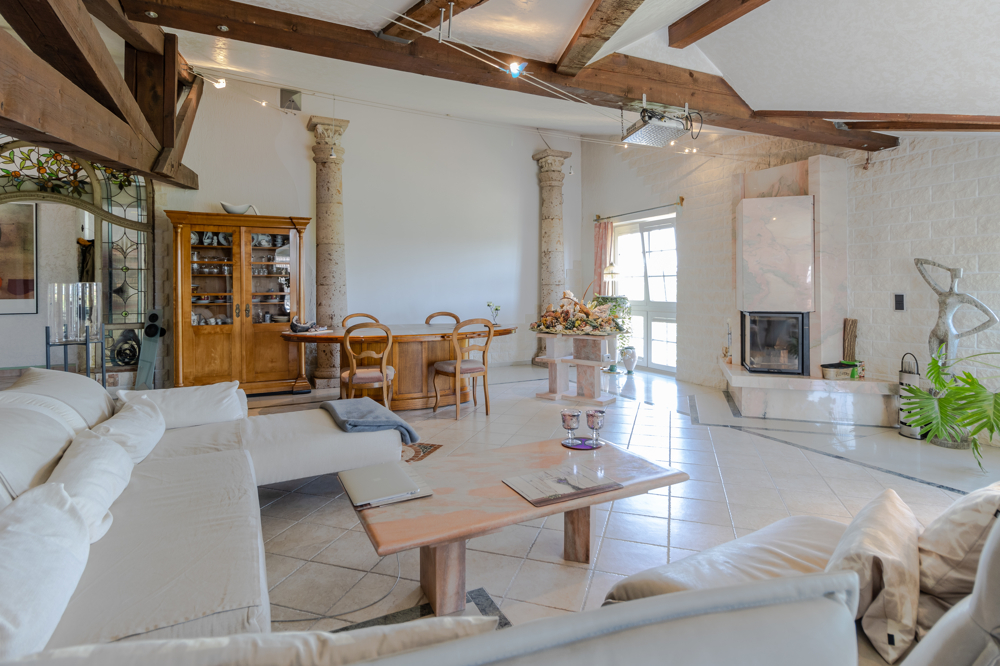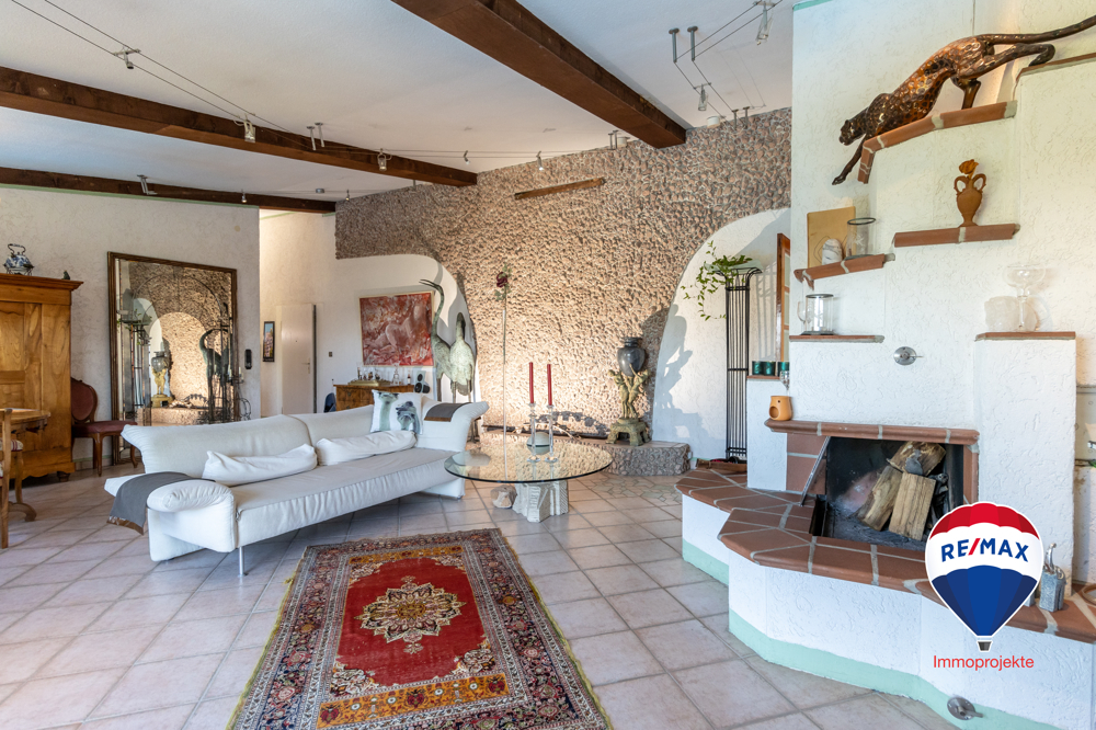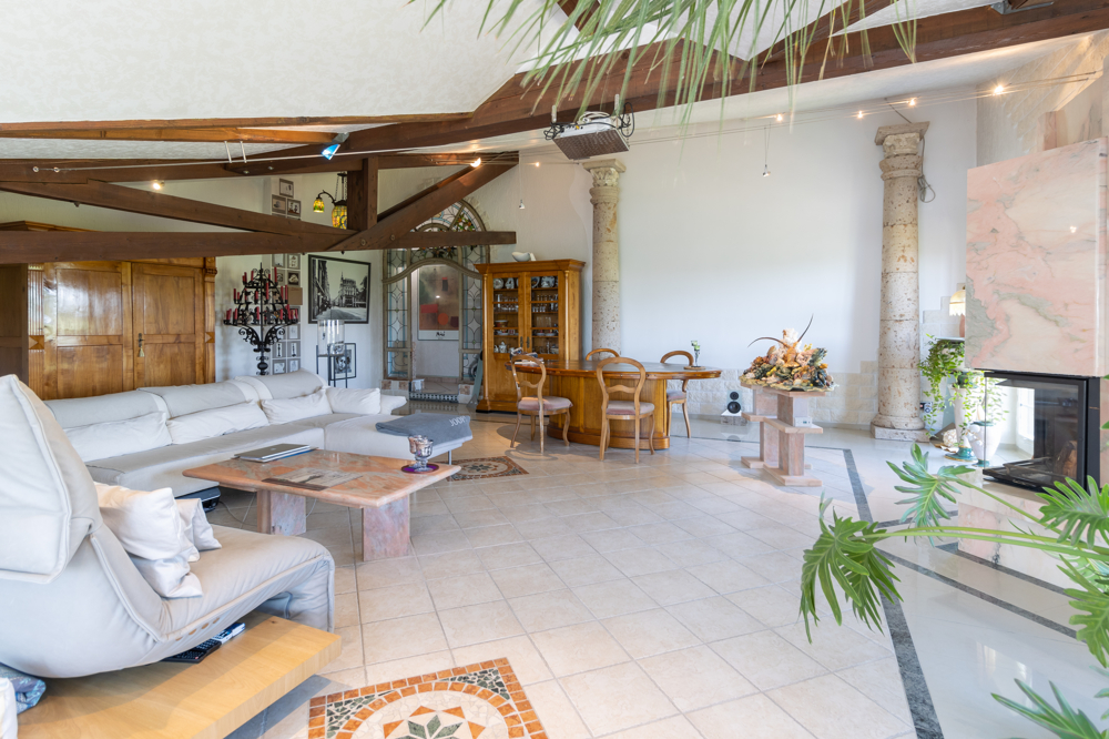 Vom Eingang werden Sie zur linken Seite von einem großzügigen Wohn-Essbereich empfangen. Ein offener Kamin verspricht gemütliche Stunden. Ein Wasserfall an der Wand ergänzt die außergewöhnliche Atmosphäre.