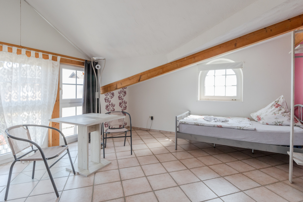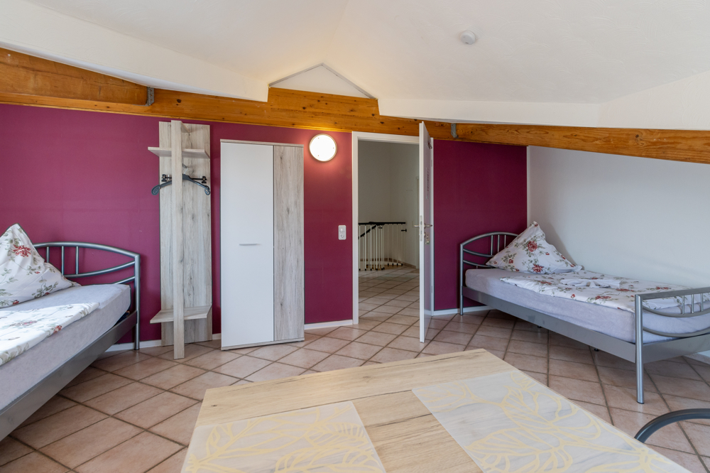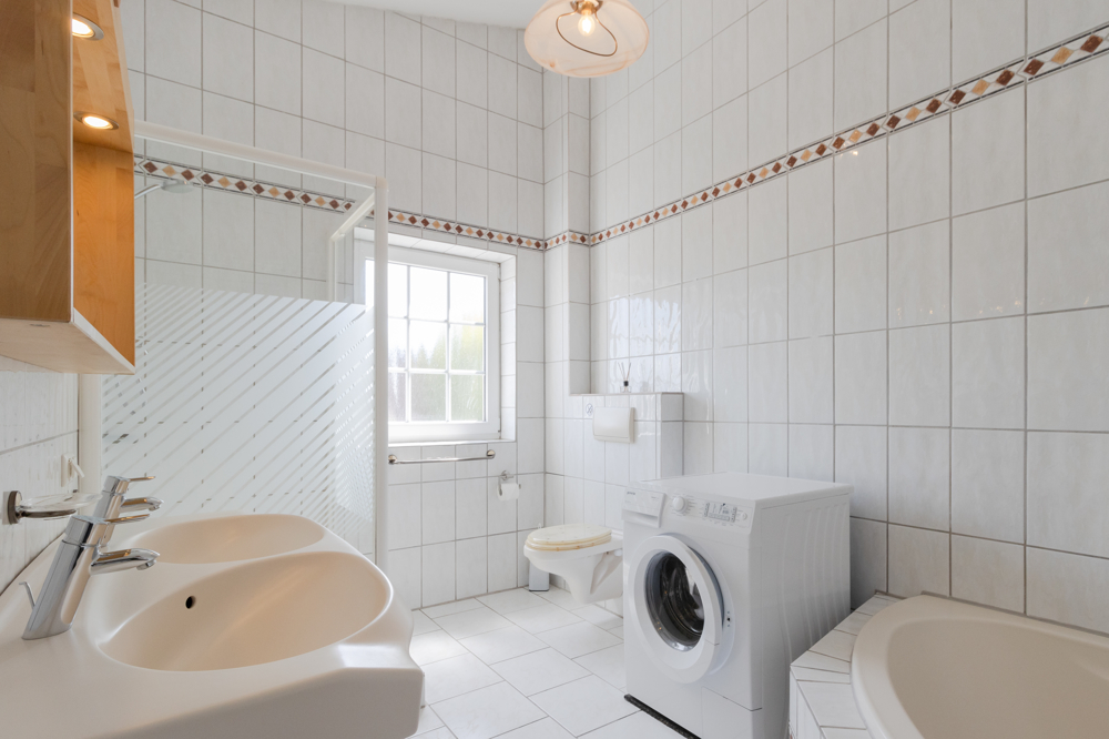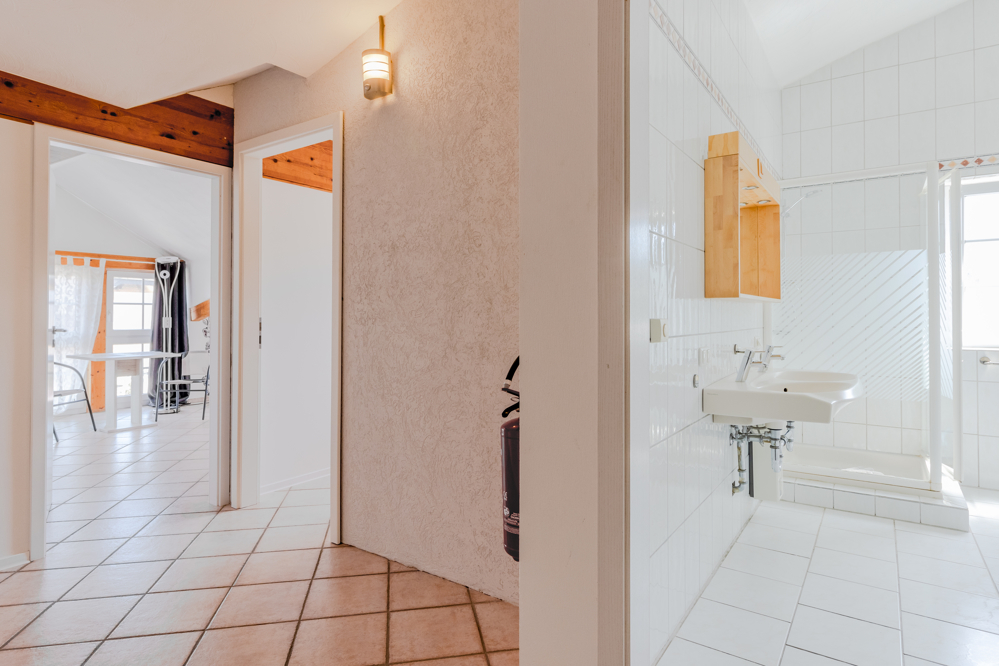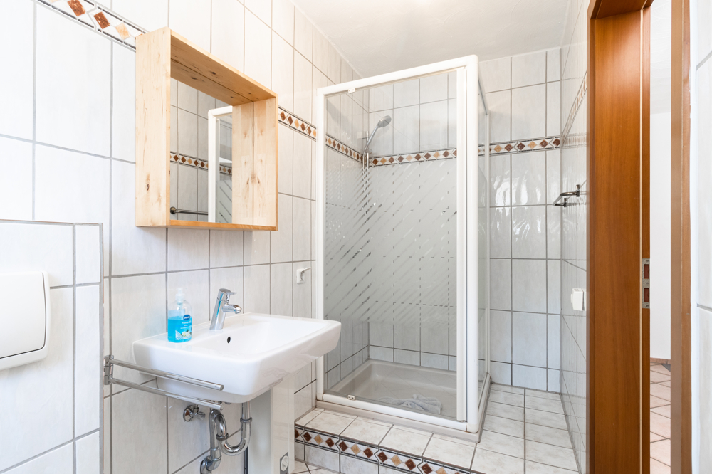 Ergänzt werden die Räume im Erdgeschoss mit einem modernen Duschbad mit Tageslicht. Folgen Sie uns über eine Wendeltreppe in die obere Etage!