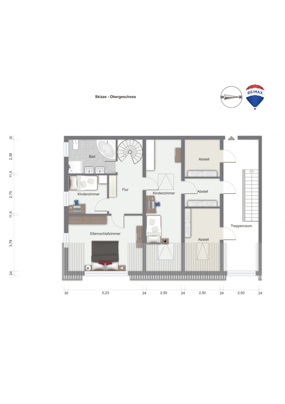 Hier befindet sich das Elternschlafzimmer mit markanten Details, wie einem tollen Giebelfenster, halbrunden Seitenfenstern und kleinen Schrägen. Daneben befindet sich eine Ankleide. ein Kinderzimmer und ein großes Fensterbad mit Eckbadewanne und Dusche.