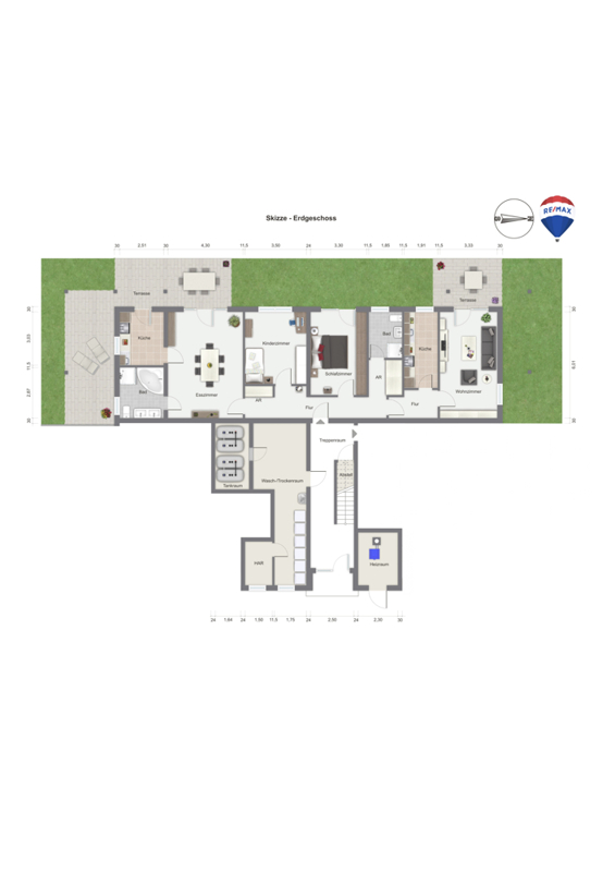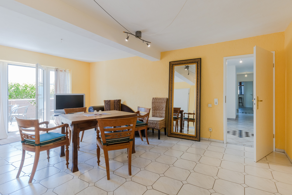 Im linken Bereich der Wohnung befindet sich ein großzügiges Wohn-Esszimmer, dem sich die Küche anschließt. Von der Küche haben Sie Zugang zur Terrasse und zum Garten. Für Eltern und Kinder stehen aktuell insgesamt 4 Schlafzimmer und 2 Bäder zur Verfügung.