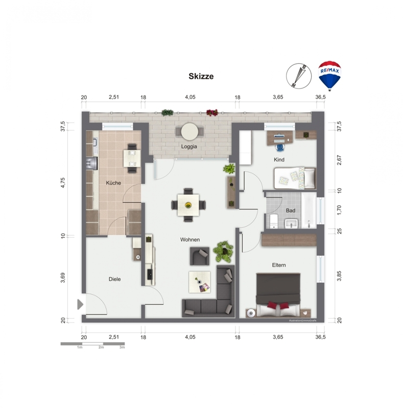 Die Raumaufteilung ermöglicht sowohl Paaren als auch kleinen Familien geeignete Rückzugsmöglichkeiten und ein harmonisches Beisammensein.
