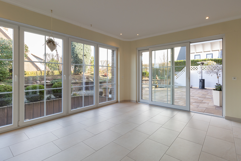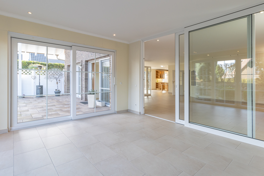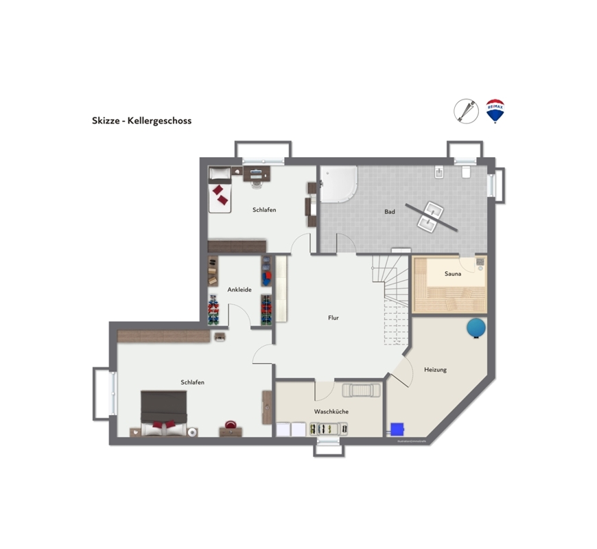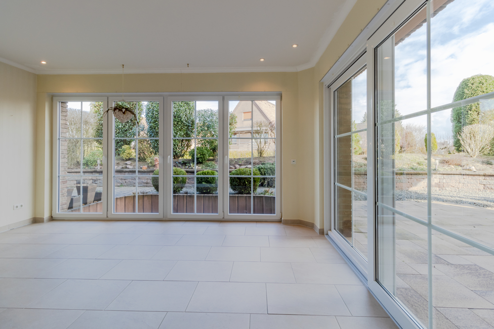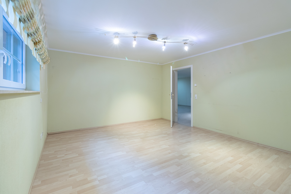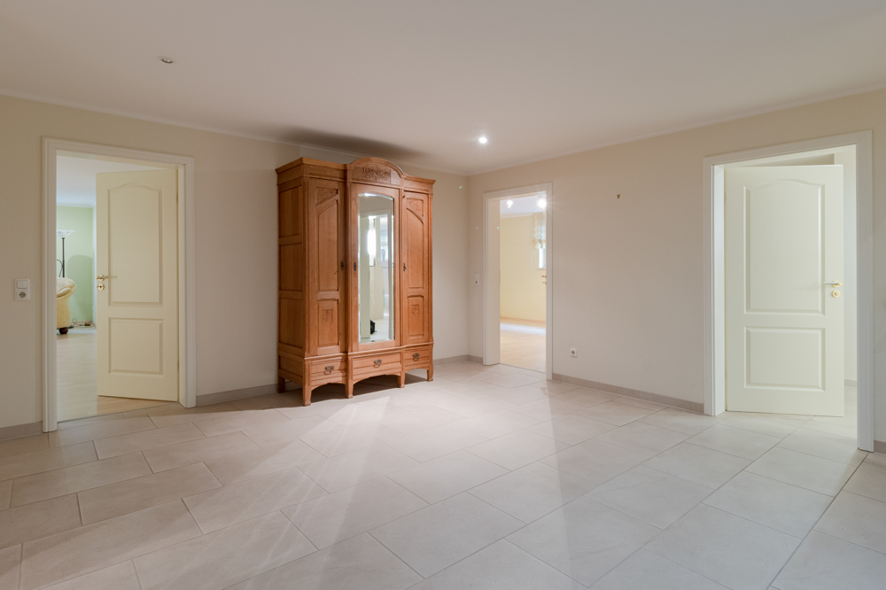 Alle Räume im Untergeschoss haben große Fenster mit Tageslicht. Zu einem der zwei Schlafzimmer gehört zusätzlich noch ein Ankleidezimmer mit Einbauschränken.