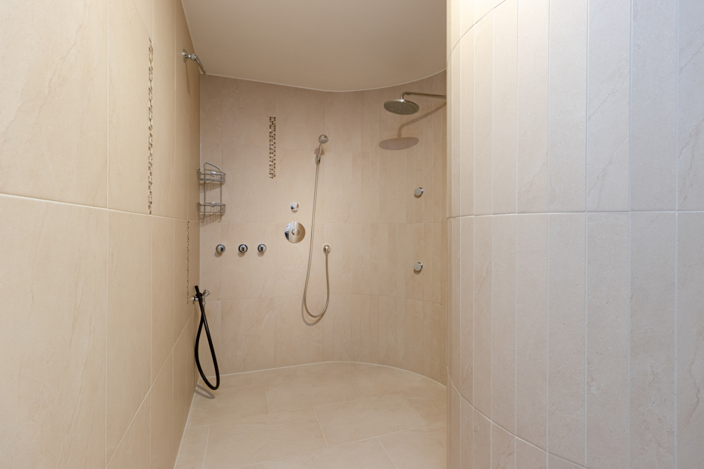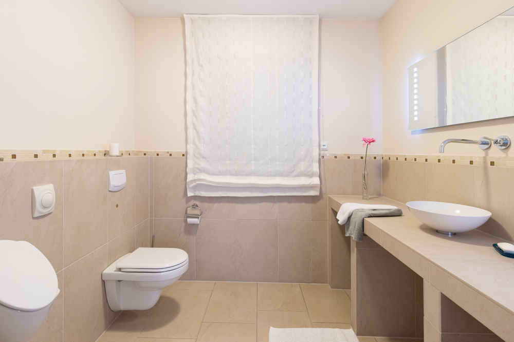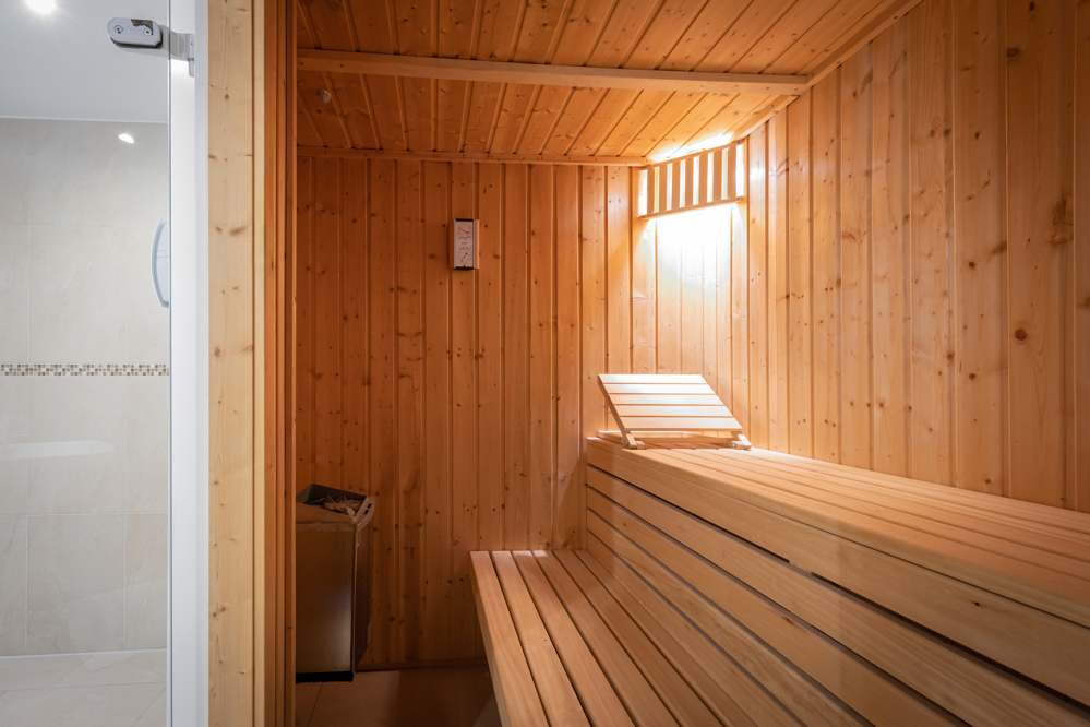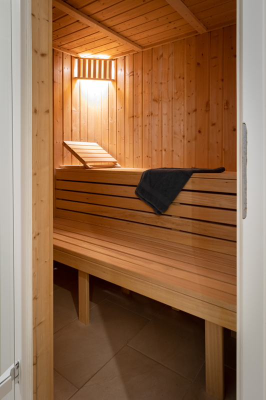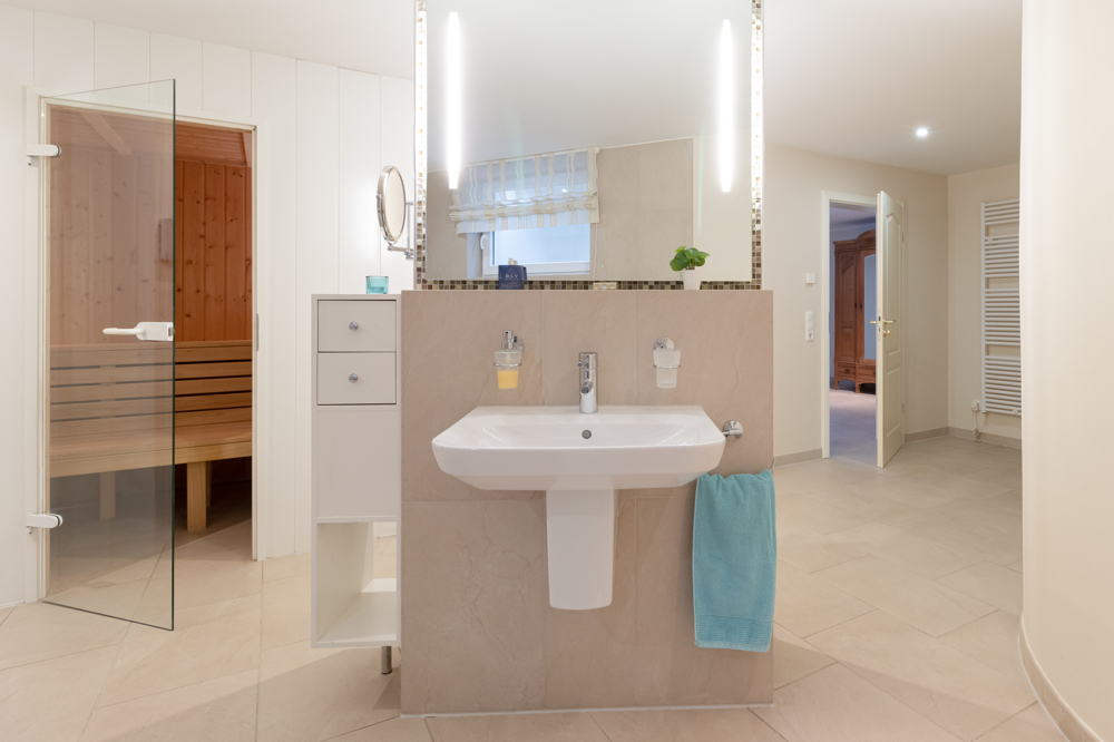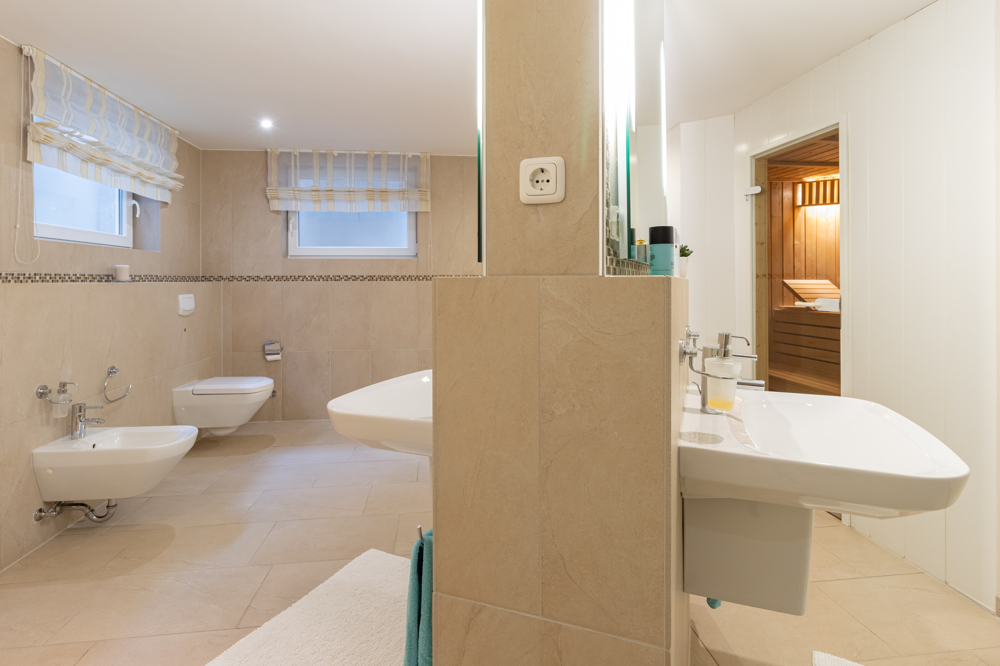Highlight im Untergeschoss ist sicherlich der großzügige Wellnessbereich mit Bad und Sauna, die ausreichend Platz für 4 Personen bietet.