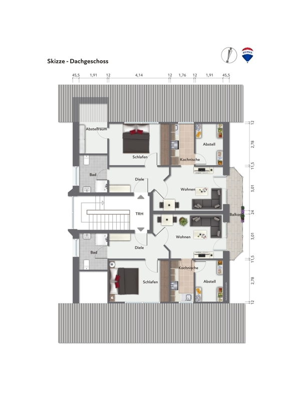 -Ebenfalls zwei 2-Zimmerwohnungen im Dachgeschoss mit ca. 46m², ebenfalls mit Balkon
