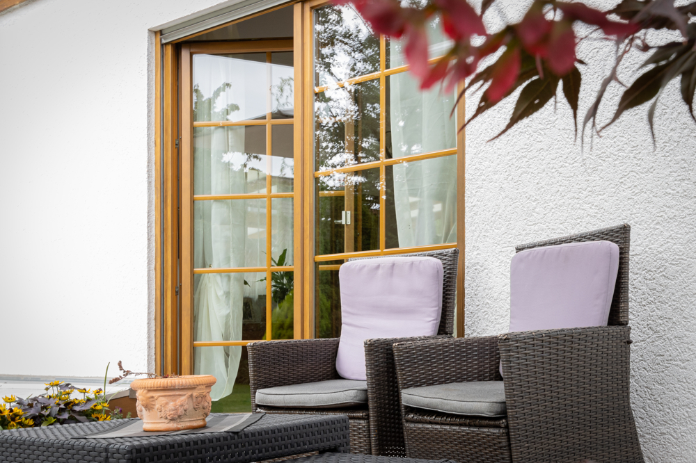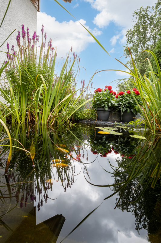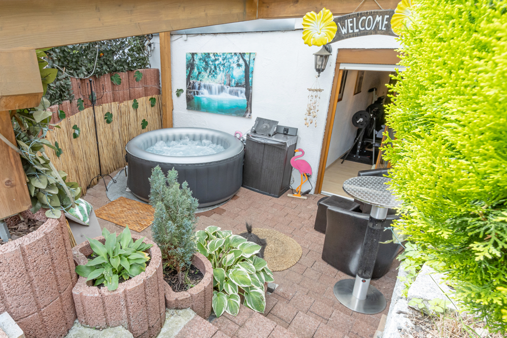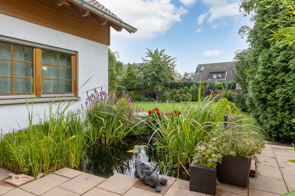 Der liebevoll angelegte Garten mit Terrassen, Teichen und Grillecke lädt zum Relaxen ein und Sie können mit Ihrem persönlichen Wellnessbereich den Alltag entspannt ausklingen lassen.