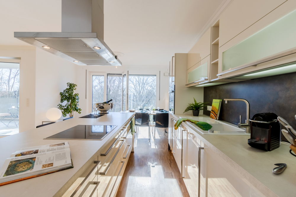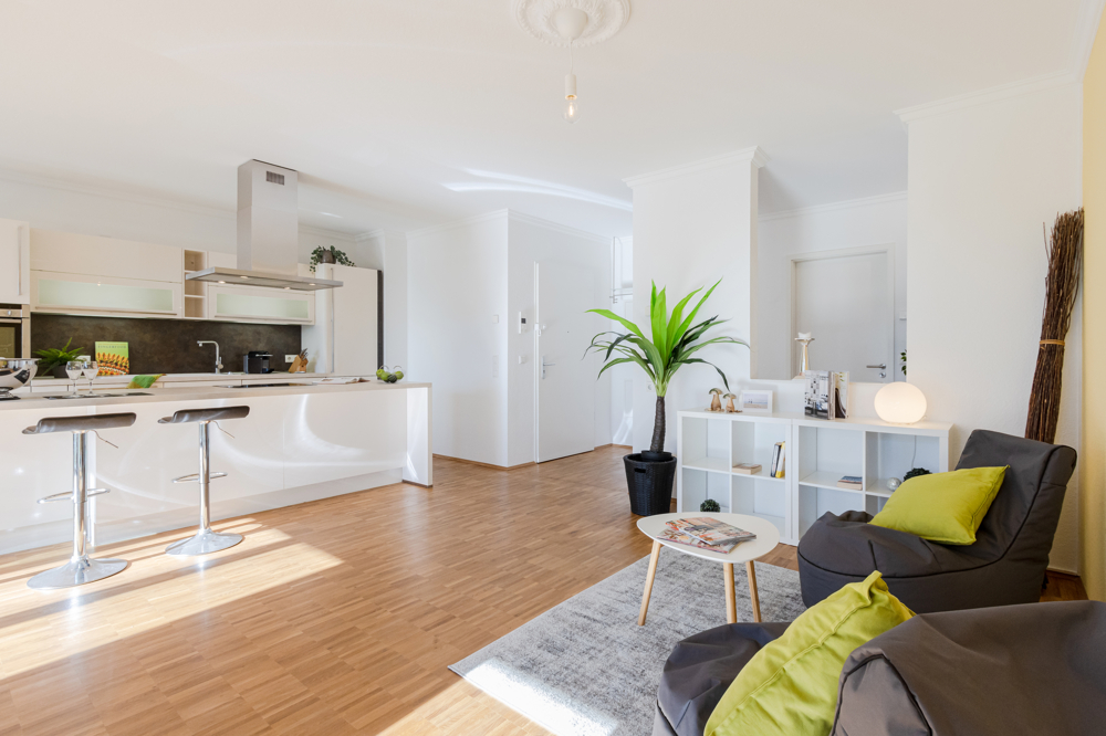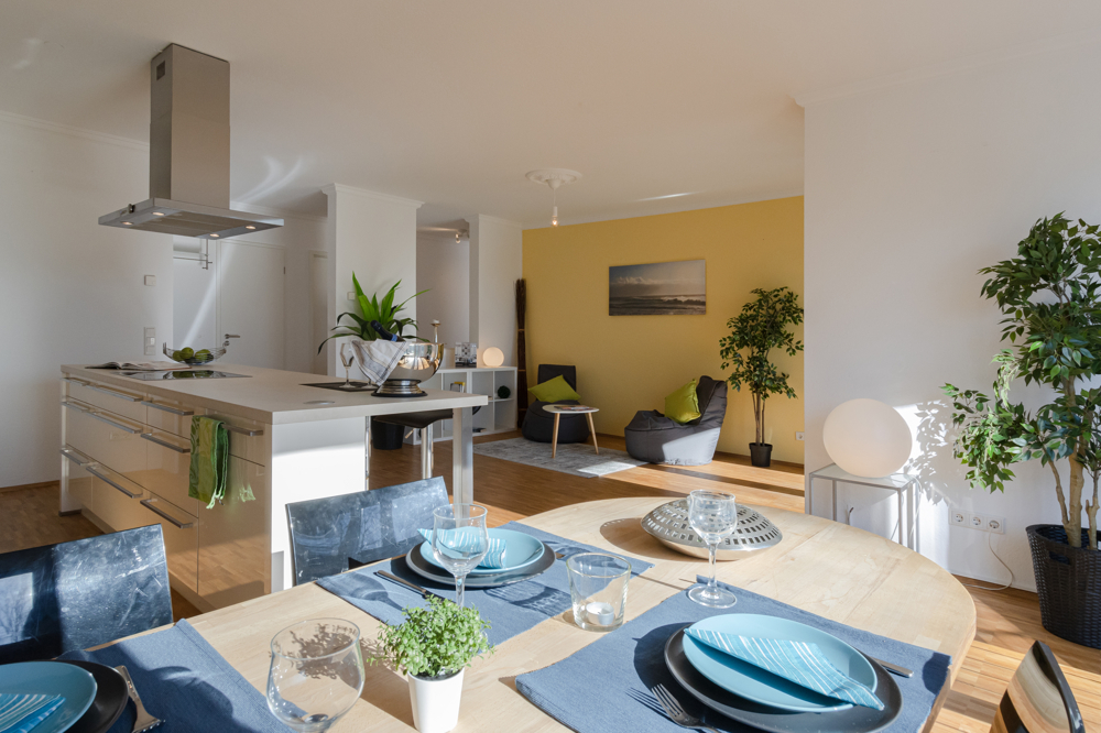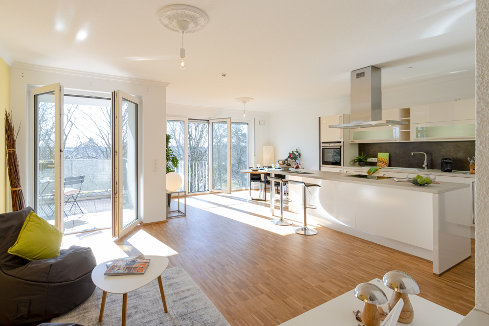 Herzstück der Wohnung ist das großzügige Wohn-Esszimmer mit offener Küche und bodentiefen Fenstern.