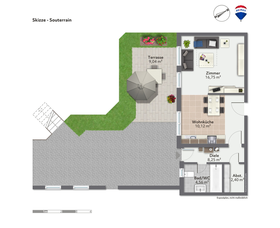Trotz ihrer Lage im Souterrain bietet diese Wohnung viel Platz und Licht durch die großzügigen Fenster zur Terrasse.