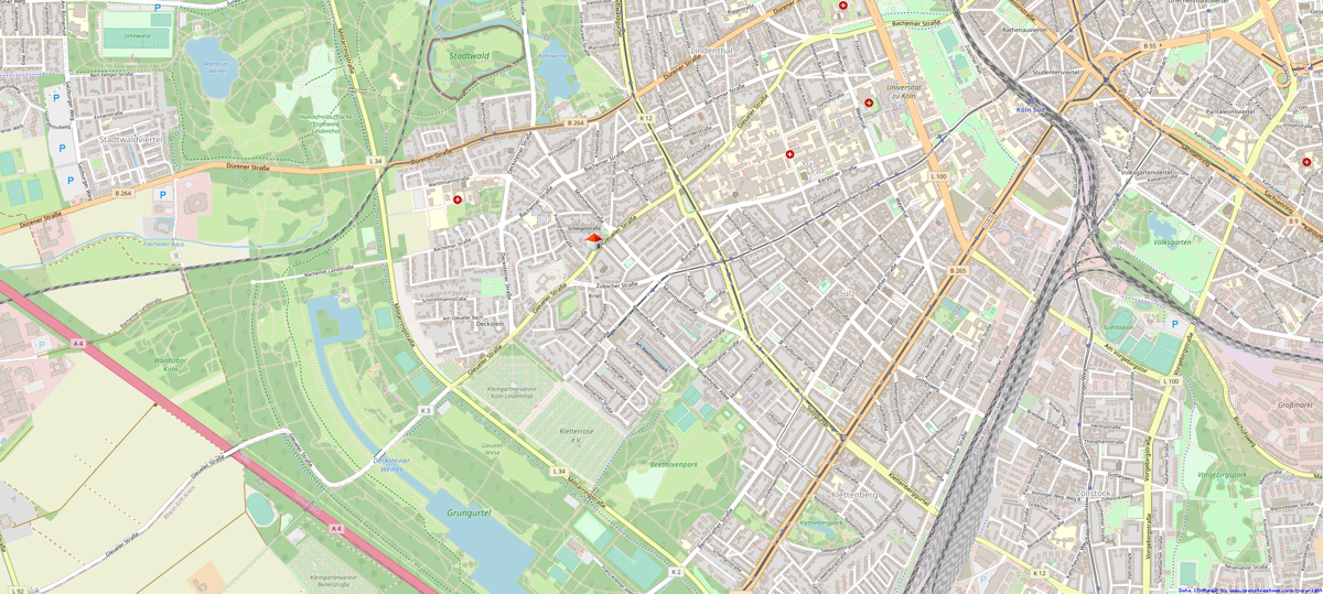 Mit den Stadtbahnlinien 7 oder 9 gelangt man in kurzen Zeittakten zur Innenstadt (in ca. 16 Min.) und zur Universität (in ca. 6 Min.). Diverse Buslinien ergänzen das Angebot des ÖPNV. Die nahegelegene Dürener Straße bietet alle Einrichtungen für die tägliche Versorgung, wie Supermärkte, vielfältige Einzelhandelsgeschäfte, Ärzte, Apotheken und eine bunte Palette von Angeboten der Gastronomie. Die Wohnung liegt an der Grenze zum Stadtteil Sülz, das quirlige und urbane Pendant zu Lindenthal. Hier kann man auf diversen Plätzen mehrmals in der Woche die vielfältigen Angebote der Wochenmärkte genießen. Alle diese Ziele sind fußläufig erreichbar.