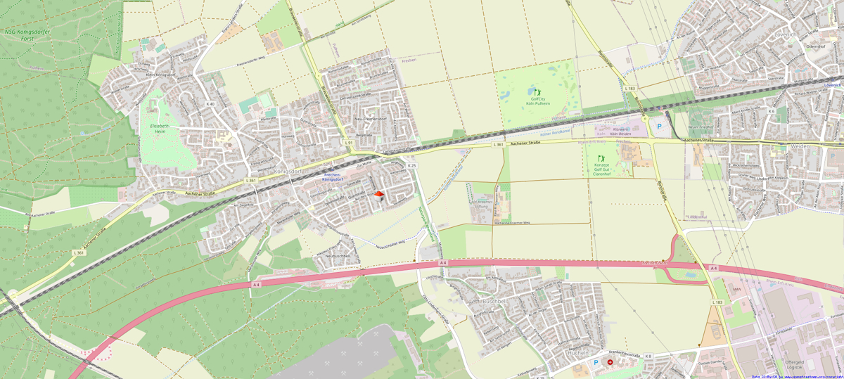 Wenige Minuten Fußweg vom Grundstück entfernt, fahren die Buslinie 957, 980 und 931. Die Ortsmitte Königsdorf sowie den S-Bahnhof Frechen-Königsdorf mit Anbindung an die Station Weiden West mit der Linie 1 (incl. Park & Ride - Parkplatz) erreicht man fußläufig in ca. 15 Minuten.