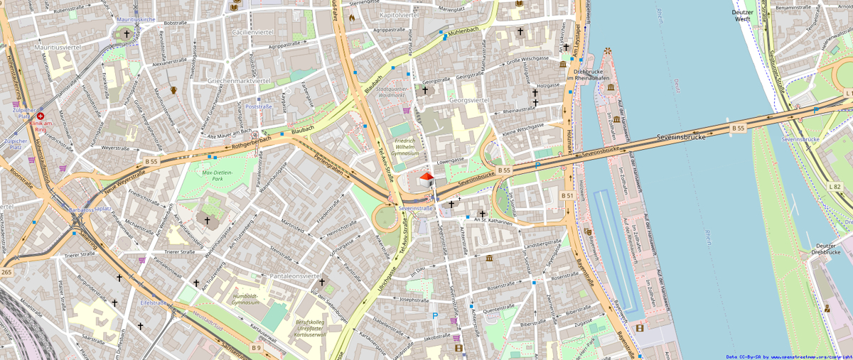 Durch die zentrale Lage ist das Mercure Hotel Severinshof Köln City bei Touristen und Geschäftsleuten sehr beliebt. Der Kölner Dom, das Schokoladenmuseum und der Hauptbahnhof sind jeweils in etwa 12 Gehminuten zu erreichen. Zur Köln Messe benötigen Gäste ca. 7 Minuten Fahrzeit. Ebenso nah sind zahlreiche große Unternehmen und das Rhein-Energie-Stadion. Gäste, die mit dem Auto anreisen, folgen der Beschilderung "Severinstraße". Eine Bushaltestelle befindet sich direkt am Hotel, die U-Bahnanbindung befindet sich in unmittelbarer Nähe.Ausstattung: