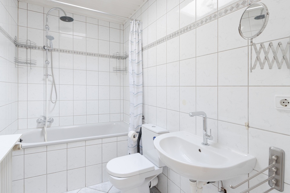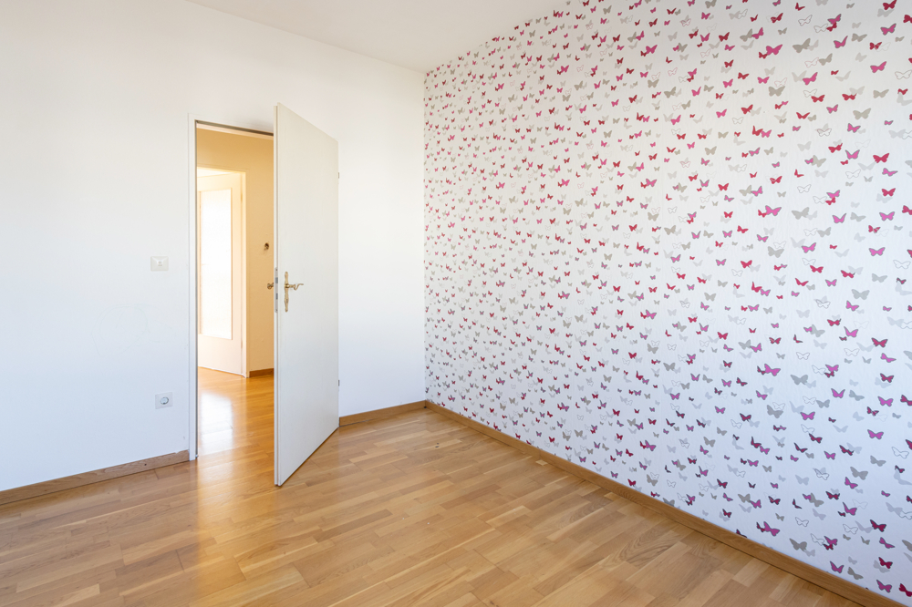 Die drei Schlafzimmer liegen auf der Nordseite mit Blick auf die Grünfläche bzw. den Spielplatz. Das hell geflieste Badezimmer mit Wanne, Waschtisch und WC verfügt über ein Oberlicht, was für Tageslicht sorgt.