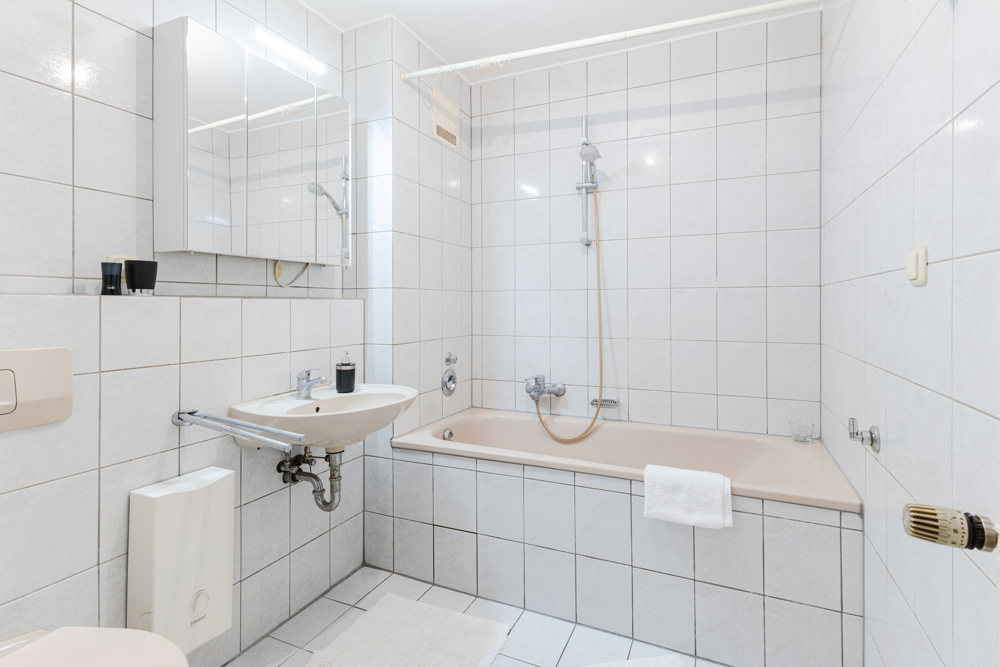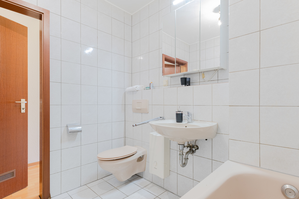 Das geräumige Bad ist mit Waschbecken, WC und Wanne ausgestattet.