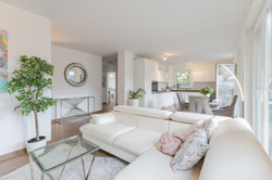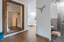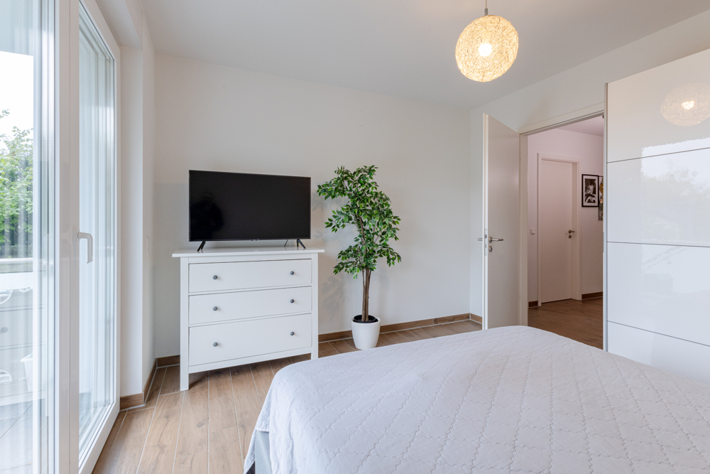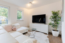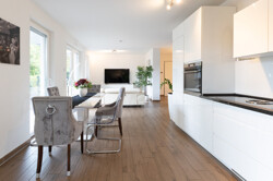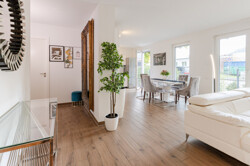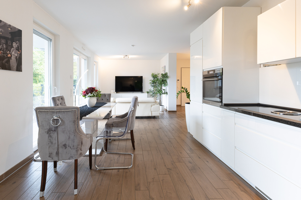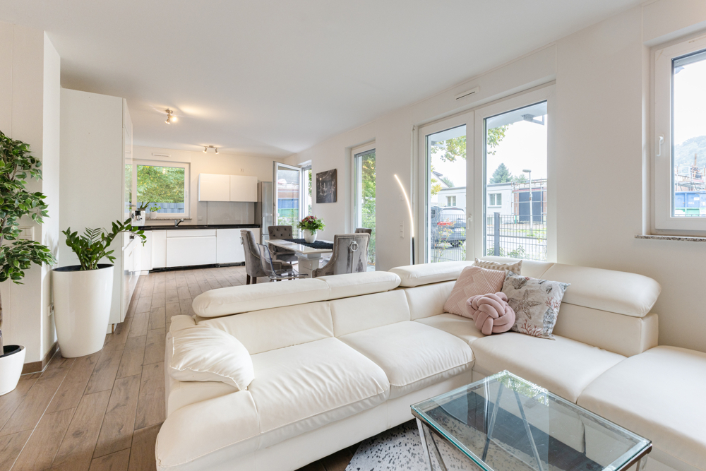 Der Boden ist durchgehend mit Fliesen in Holzoptik versehen, was eine warme, zugleich pflegeleichte Atmosphäre schafft. Große Fensterfronten lassen viel Tageslicht hinein und schaffen einen hellen, freundlichen Wohnbereich.