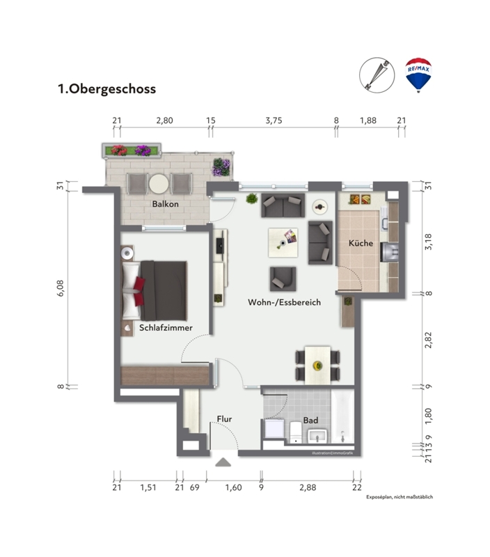 Diese schöne 2-Zimmer-Wohnung mit Südwest-Balkon befindet sich in einem viergeschossigen Mehrfamilienhaus. Die Wohnung im 1. Obergeschoss erreichen Sie bequem über das Treppenhaus oder mit dem Aufzug.Die ca. 56 m² große Wohnung umfasst ein Vollbad mit Lüftung, einen großzügigen Wohn-/Essbereich, ein Schlafzimmer sowie eine Küche. Vom Wohnbereich aus gelangen Sie auf den Balkon.