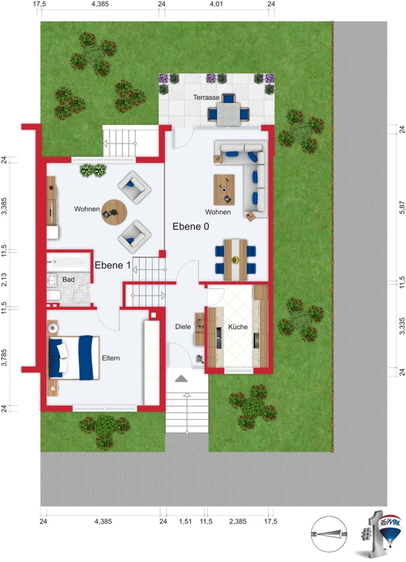 Besondere Einrichtungen: Markise im Terrassenbereich, Klimaanlage im EG (1/0)