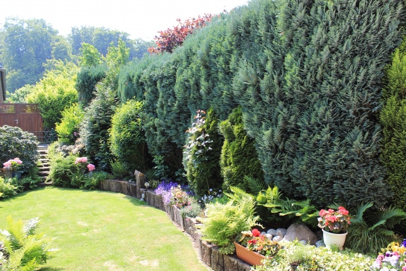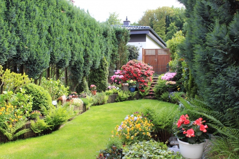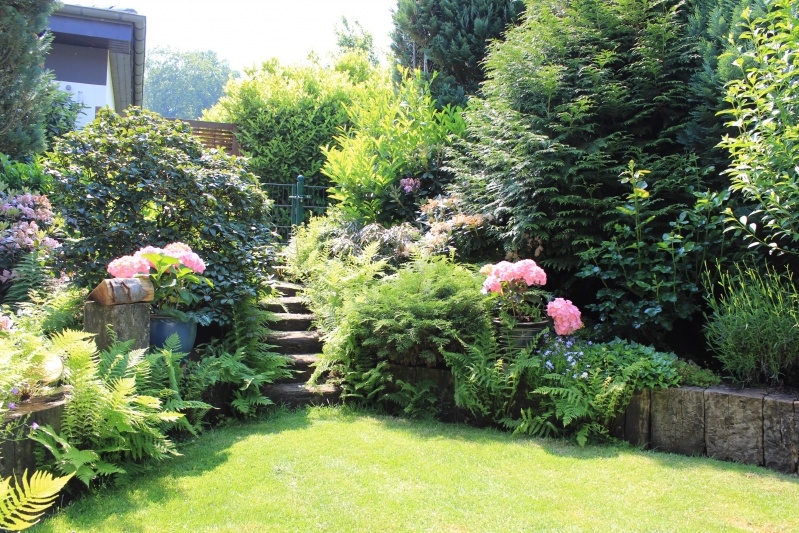Gepflegter Garten mit Sichtschutzhecke und wertiger Bepflanzung sowie Wasserspiel und Beleuchtung entlang der Beete.